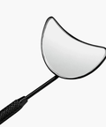 A unique moon shape mirror rest perfectly on the client's under-eye or cheek, offering a full and unobstructed view of the lashes.